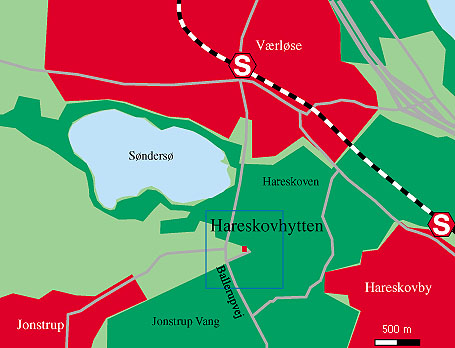 Kort fremstillet til hjemmeside, der viser placering af en spejderhytte. Tegning: Niels Ebbesen |
